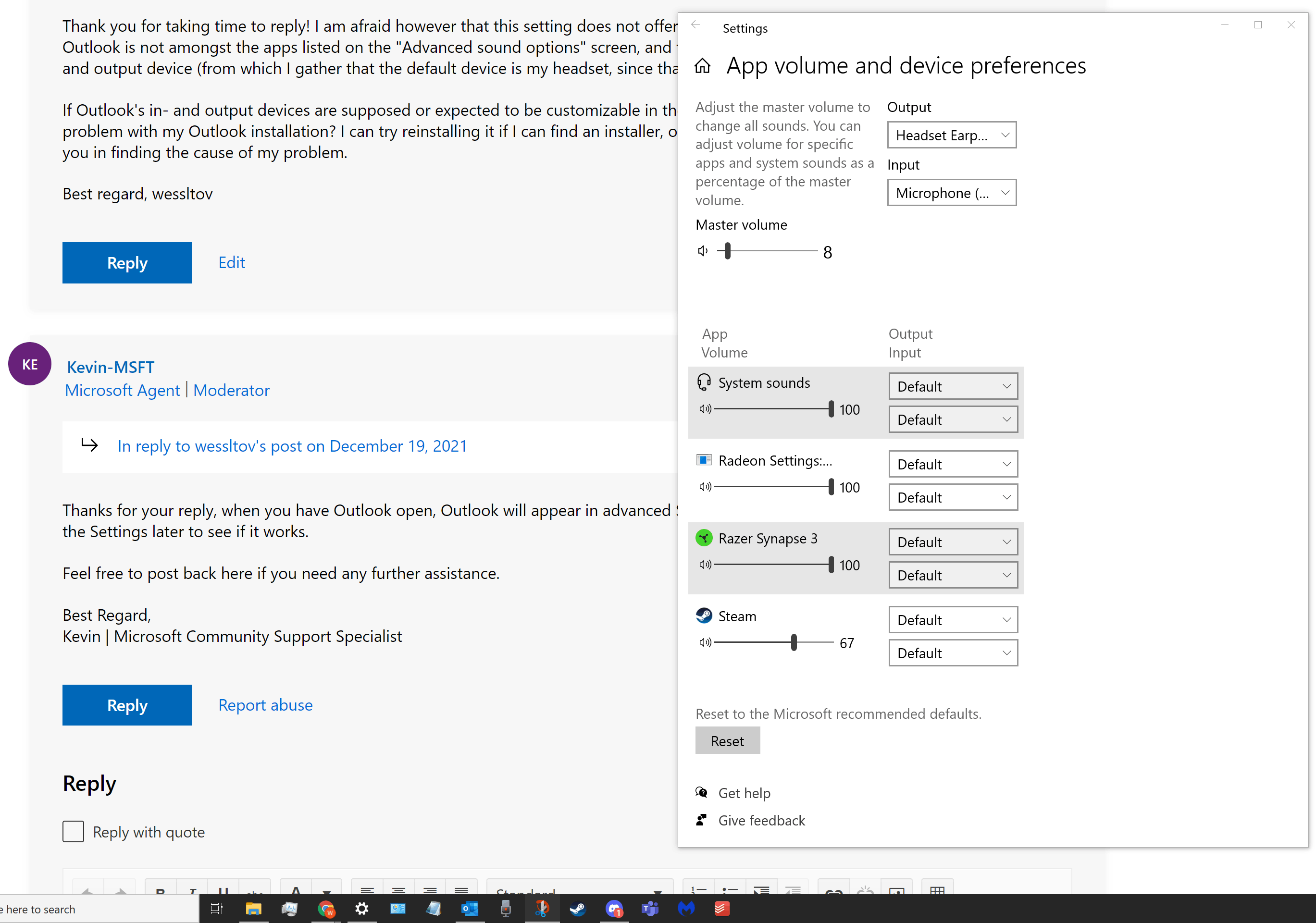 You could change your headphones to the output device in Device Manager, which is fine, but Outlook as an application generally defaults to the first monitor as the output device. You need to set your headset as the output device in the application Default device. Here are the steps: