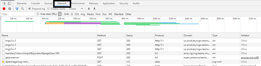 then click one section in Teams to open section-> check if there’s related requests as well as other traffics generated in Network tab: