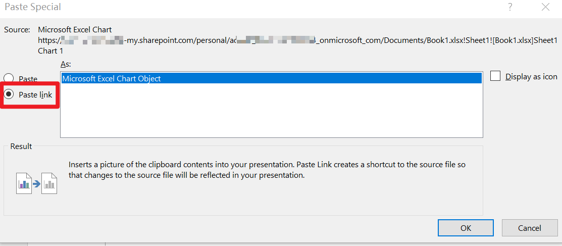 - Copy the chart from Excel file, and paste it as link like below image in PPT.