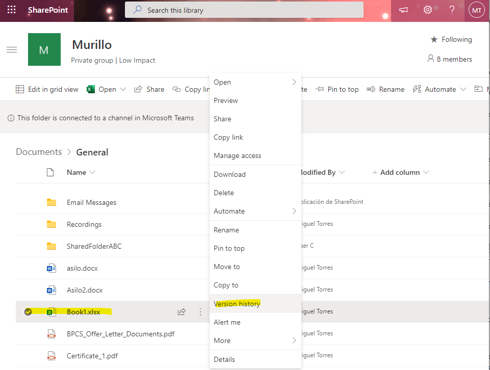 Once you are in SharePoint, again make right click on the Excel file and hit the Version History option.