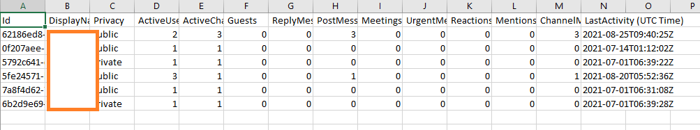 And the CSV report output has number of guests, reply messages, active users, active chats, meetings, mentioned etc. And it will look like as below: