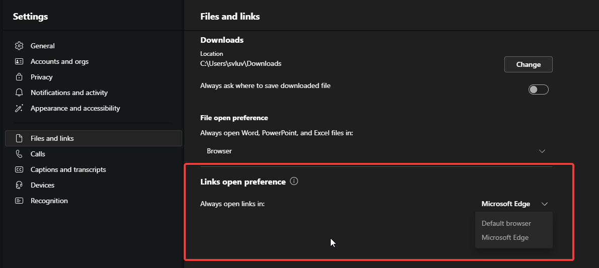 I am using Teams for organization/work. I do have my useful login/bookmarks in Edge and so I want to open links from Teams in MS Edge. The rest of the PC should use the default app as configured in the Windows OS setting. It will be very easy for us to managed saved login etc.