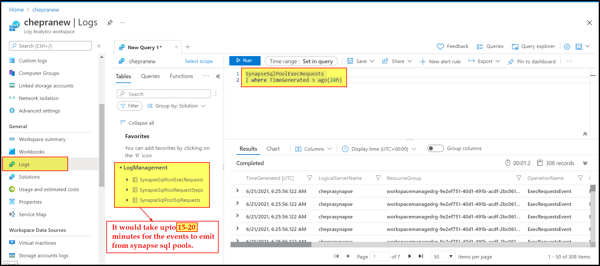 After configuring the diagnostics settings, it would take up to 15-20 minutes for the events to emit from Synapse SQL Pool into the Log Analytics workspace.