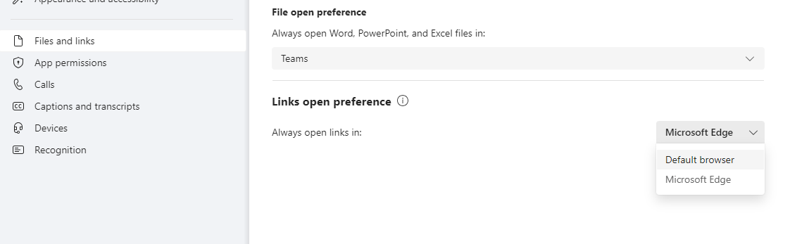 "If you want to turn off the open links in Edge feature, you can do so from Teams settings: Open Settings > Files and links > Link open preferences, and then select the desired browser from the dropdown menu.