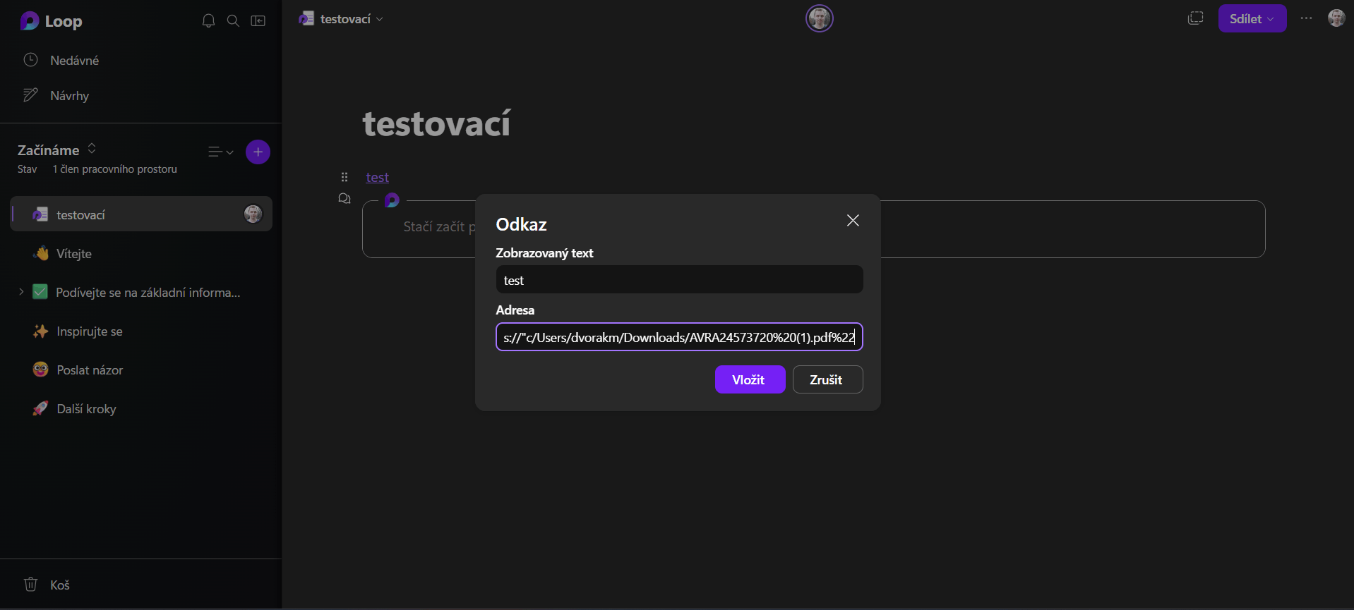 As for your information, it seems that you want to insert a link connected to a local file on your computer. This is impossible since the link to your file need to be a network hyperlink, not a local file path. If you want your file to be connected within this loop page, you need to upload your file to a cloud storage space first. OneDrive would be a good option. After uploading, you can get an online path for your file. Paste it in the input box and you'll complete this process.