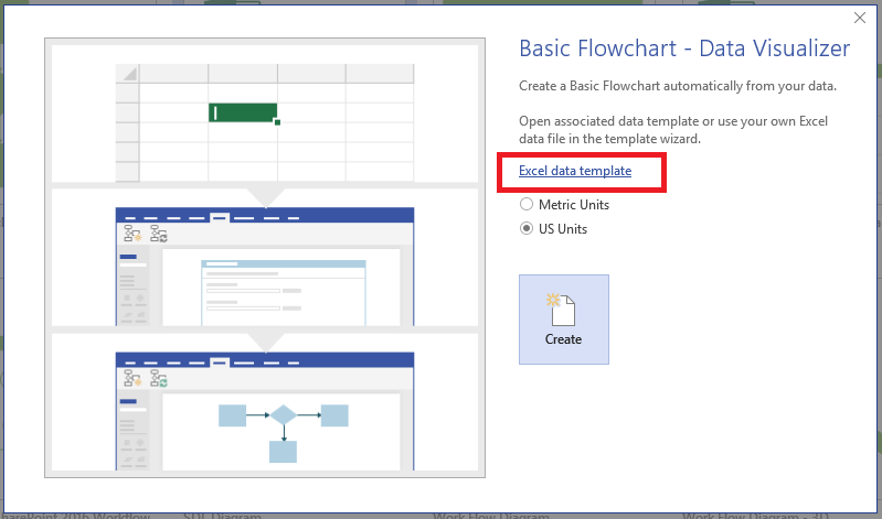 - Click on any of the two templates to launch template preview. In the description, you’ll see a link to an Excel data template that helps you represent your process flowchart steps in Excel.