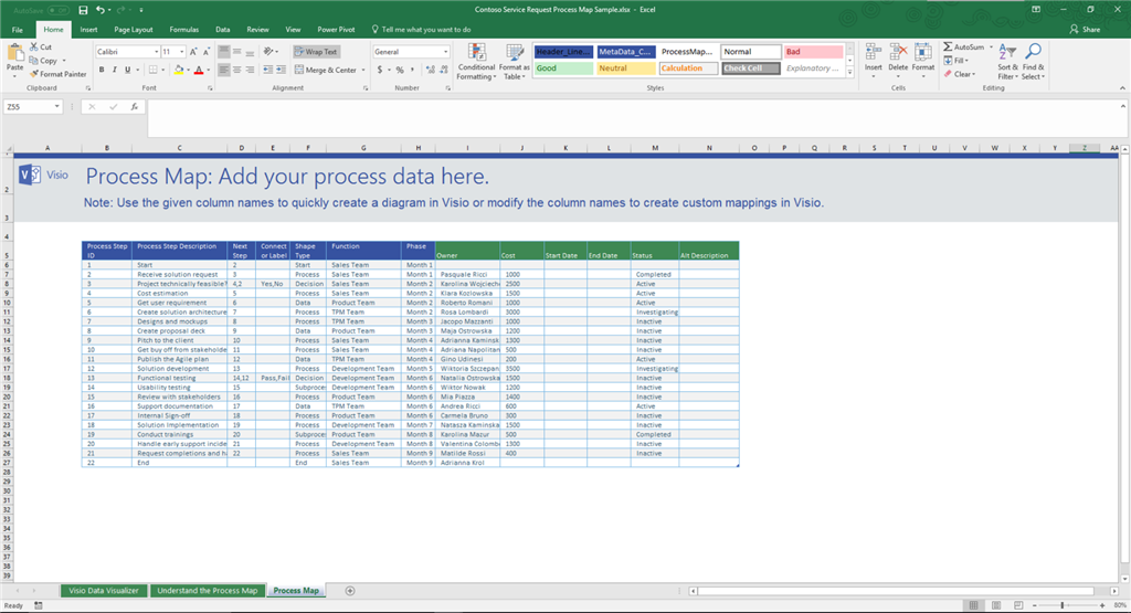 - Enter your process steps in the Excel and save the file. The Excel file has help content and snapshots of sample data to get you started.