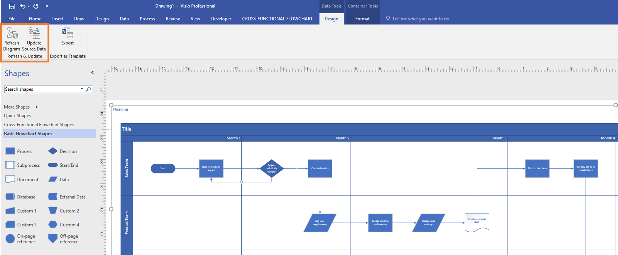 - Select the diagram container in Visio and click Refresh (in the Data Tab ‘Create from Data’ section) to update the diagram