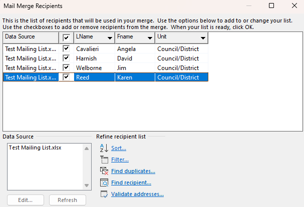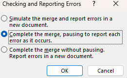 Word could not merge the main document with the data source because the data records were empty or no data records matched your query options.