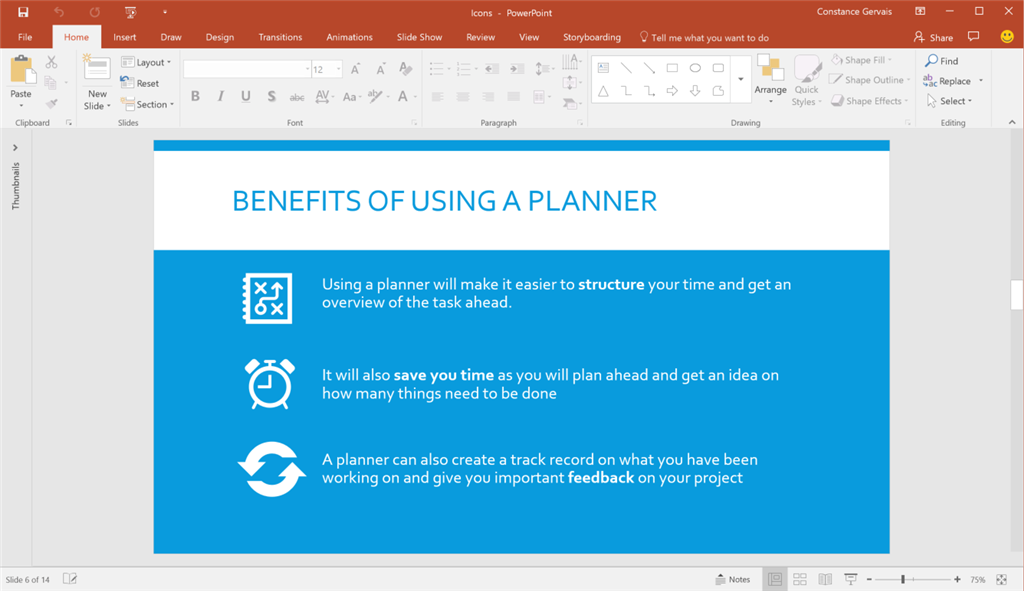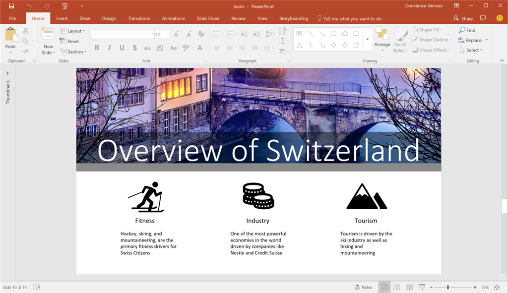 My name is Constance, and I’m a program manager on the Office Graphics team. We're excited to announce the availability of a new collection of icons. Browse through more than 500 icons to find one that suits your purpose, and then edit its fill and outline to match a theme.