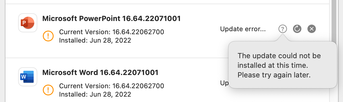 Since updating to the 16.64 versions, updates fail to install. AutoUpdate reports The update could not be installed at this time.