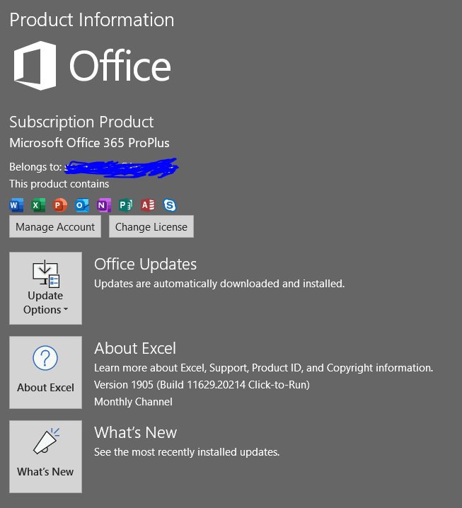 This is what I see on the accounts menu. It doesn't have the option to join Insiders and shows "Monthly Channel" instead. However, I can't use any of those new functions in Excel. What gives?