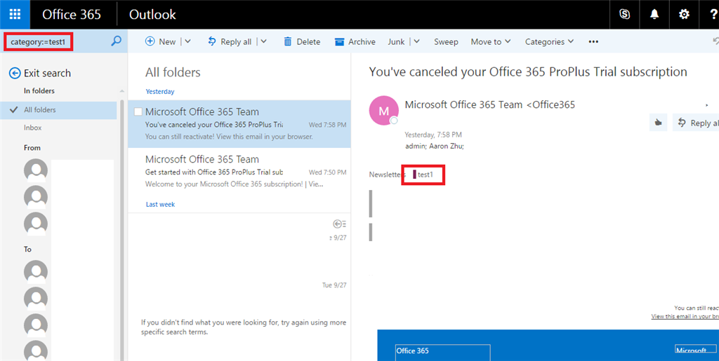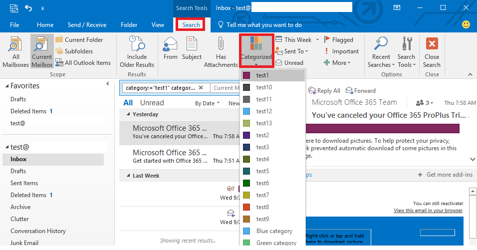 If you use Outlook for Window client, navigate to Search > Categorized, then select a specific category to display all items in this category.