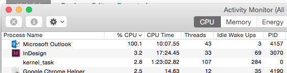 I recently purchased a Office 365 Business plan, and have installed the desktop Office 2016 apps. I am experiencing continuous high CPU utilization, causing the fan in my MacBook to run much of the time. Activity Monitor shows that Outlook is the culprit.