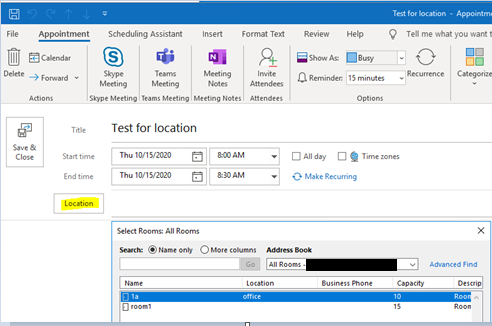 Screenshot for location’s availability in Appointment from Outlook client.