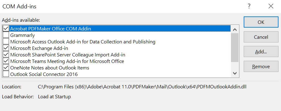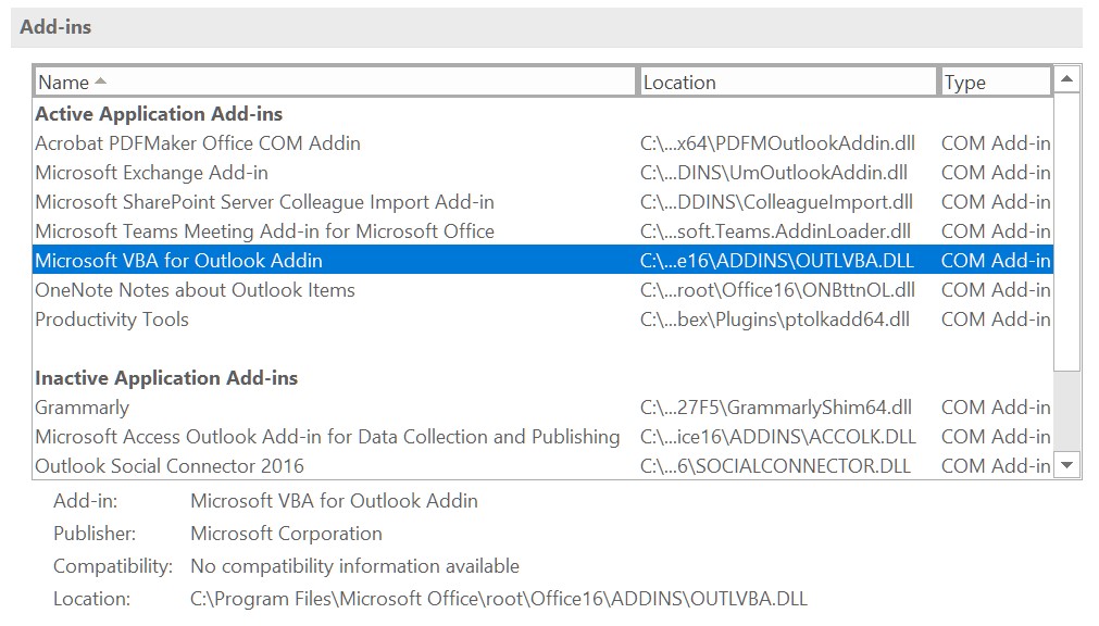 If you see “Microsoft VBA for Outlook Addin” listed as COM Add-ins under “Active Application Add-ins”, it should appear under Manage COM Add-ins and is available to be disabled. If you could not find it under COM Add-ins, please kindly check from File > Manage COM Add-ins to see if it is listed there and can be disabled.