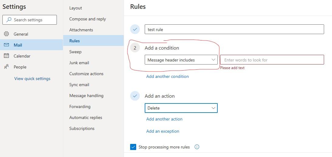 I can see the email header X-PHISHTEST in message details, but I don't see any rule options for filtering emails by headers.