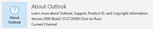 If the problem still persists, please kindly provide the screenshot about your Outlook product information to me. To get it, please click File > Office Account, please capture the screenshot under Product Information section and share it with me.