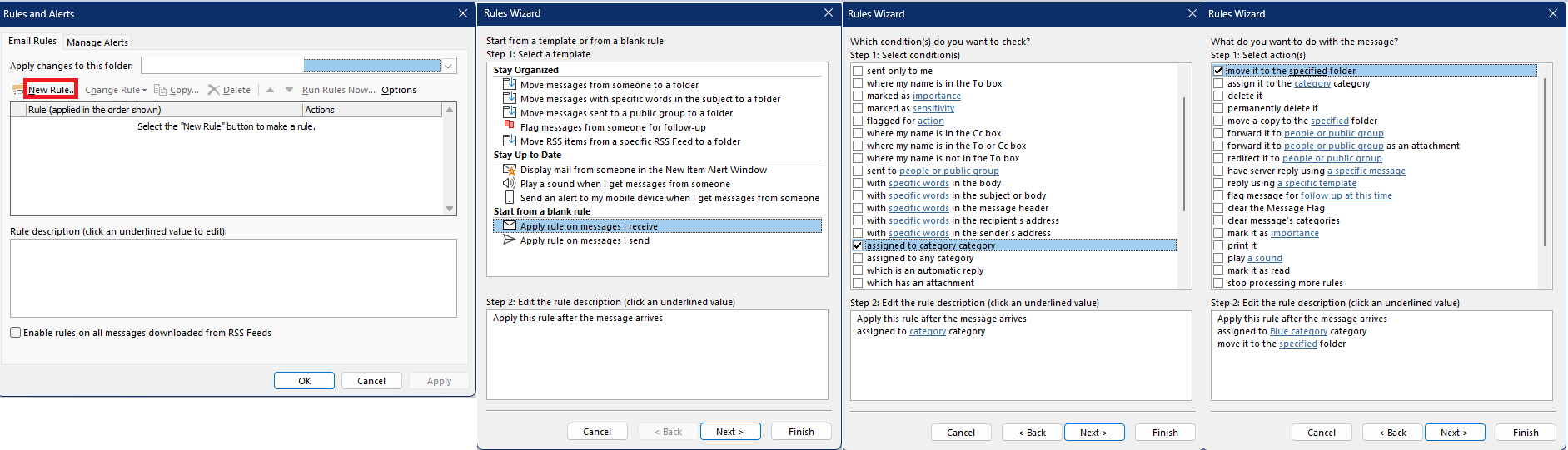 You can move the emails assigned to specific categories to the specified folders by creating rules. The steps are shown below (this is a screenshot for Microsoft 365, the steps are the same for Outlook 2019).