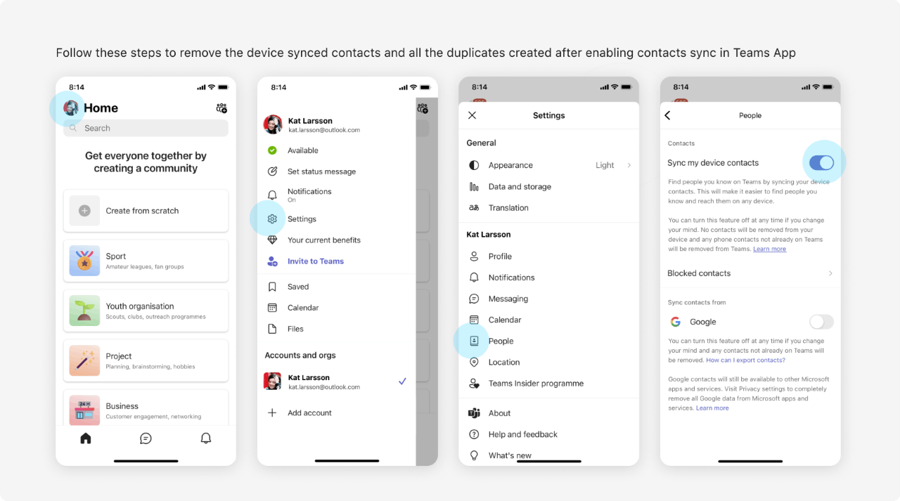 How to Delete Device Contacts Sub-Folder1. Go to Teams App on your mobile device (iOS or Android).1. Click on your Profile Icon Home and navigate to Settings and People.  on my PC. I need help very urgently