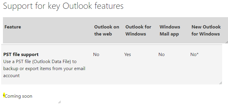 The .pst file support is not available in New Outlook for Windows. This feature is in "coming soon" status. You can find the same information from Getting started with the new Outlook for Windows - Microsoft Support .