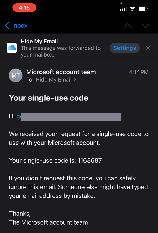 I created a Microsoft account via iCloud.com email address and when I try to sign in to the Microsoft account email is ___@___.___ and click on ___@___.___ the email and click on get code and I get the email saying the following: Hi ___@___.___,