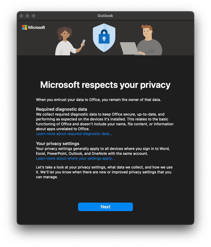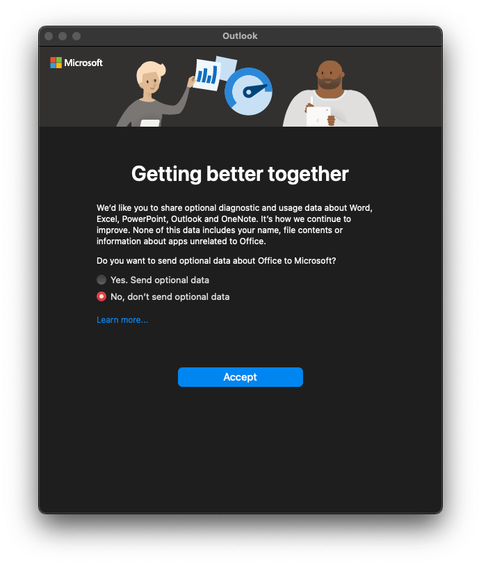 As per your description, the "Microsoft respects your privacy" windows keeps showing up when you chose "No, don't send optional data" in Outlook.