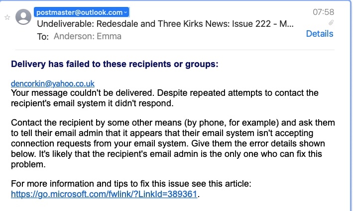 Here's the email I received. It does note state that the 'newsletter' could not be delivered, just that the message could not be delivered. It occurs to me that this could be spam disguised as the real thing and makes me wonder if the recipients Hotmail account has a bug of some kind.