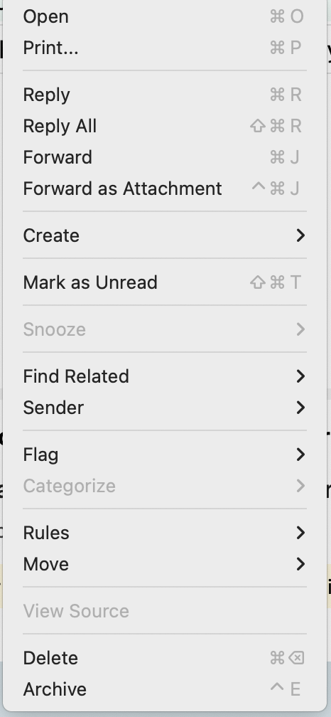 - Some other messages I have tried this on it doesn't seem to work very well, sometimes I needed to click at the very bottom of a message for the option to show - basically anywhere that wasn't the body of the email, as you can see in these two screenshots the right click was only a little further down before the option showed.