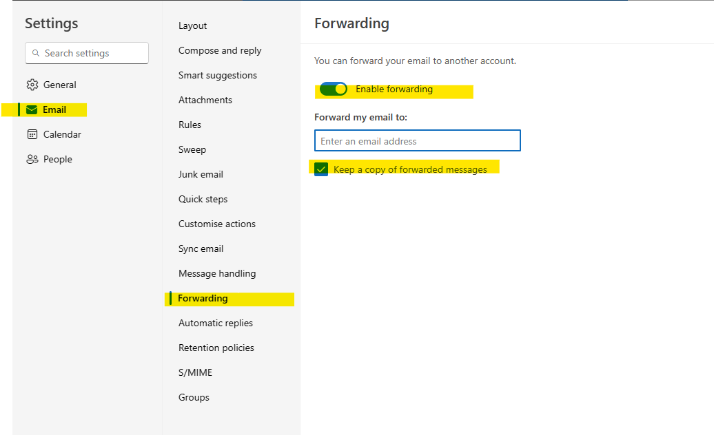 - Kindly turn on Enable Forwarding-->Make sure that Keep a copy of forwarded message is enabled if you want a copy of the original message to remain in your mailbox-->Hit Save