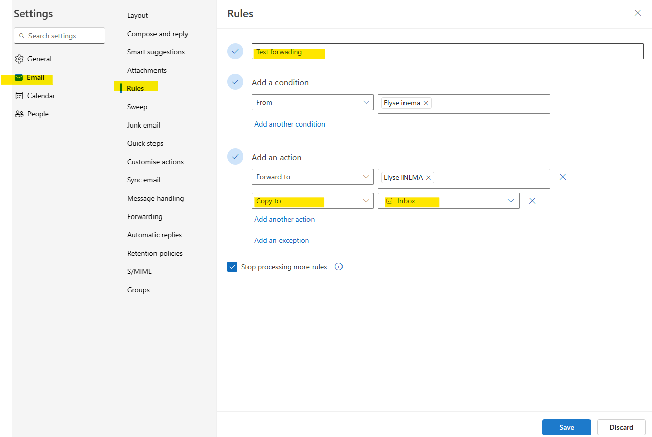 - If you want replies to messages that are automatically sent to another address to go to the original sender, Use inbox rules in Outlook on the web to create a redirect rule. To use Rule, kindly go to Settings->Email-->Rules--> Enter the name of Rule--> Add condition--> Add an action choose Forward and Enter the email address you want to redirect-->click on Add another action-->Choose Copy to-->Inbox-->Hit Save