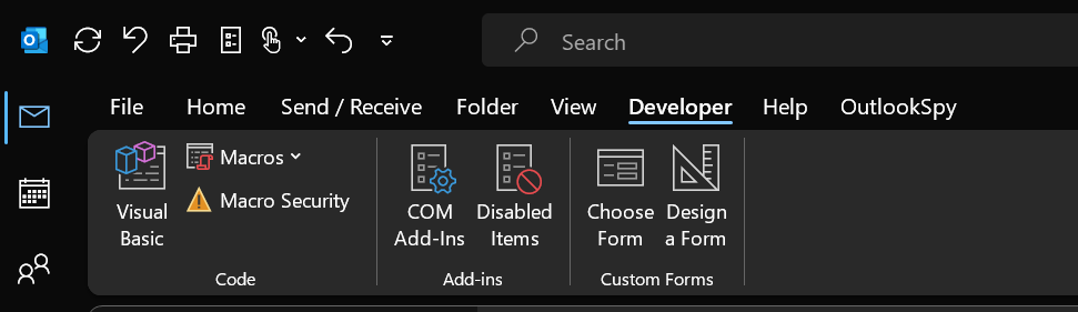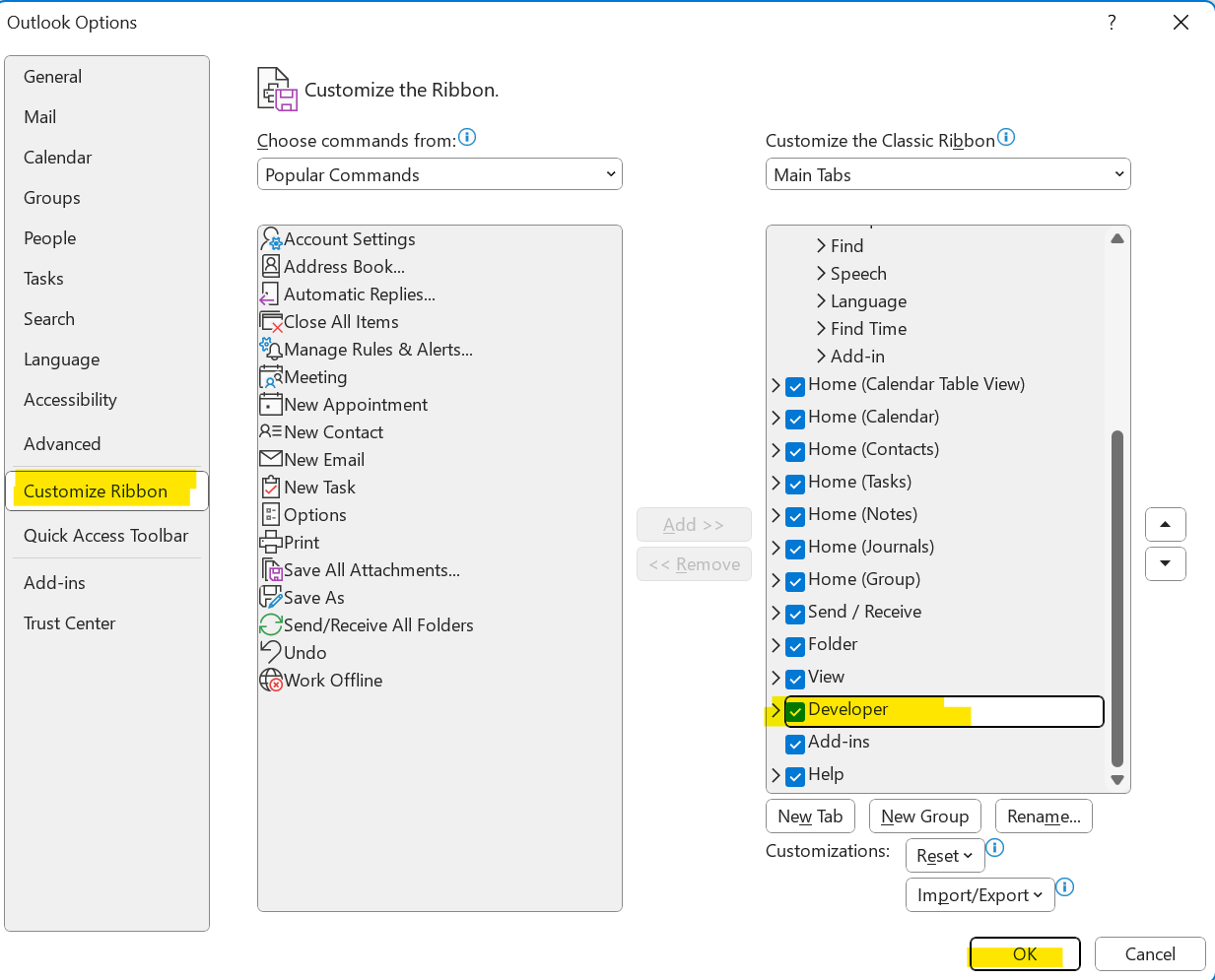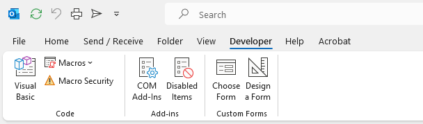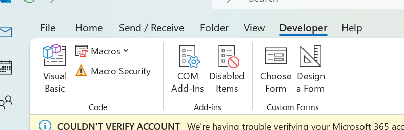 As per your mentioned description about "Trying To Add A Developer Button To An Outlook Ribbon" ACcording to your provided screenshot it seems you didn't select Developer. Kindly try to check again if you face same situation by going to File-->Options-->Customize Ribbon-->Then make sure that Developer is selected then hit Ok button