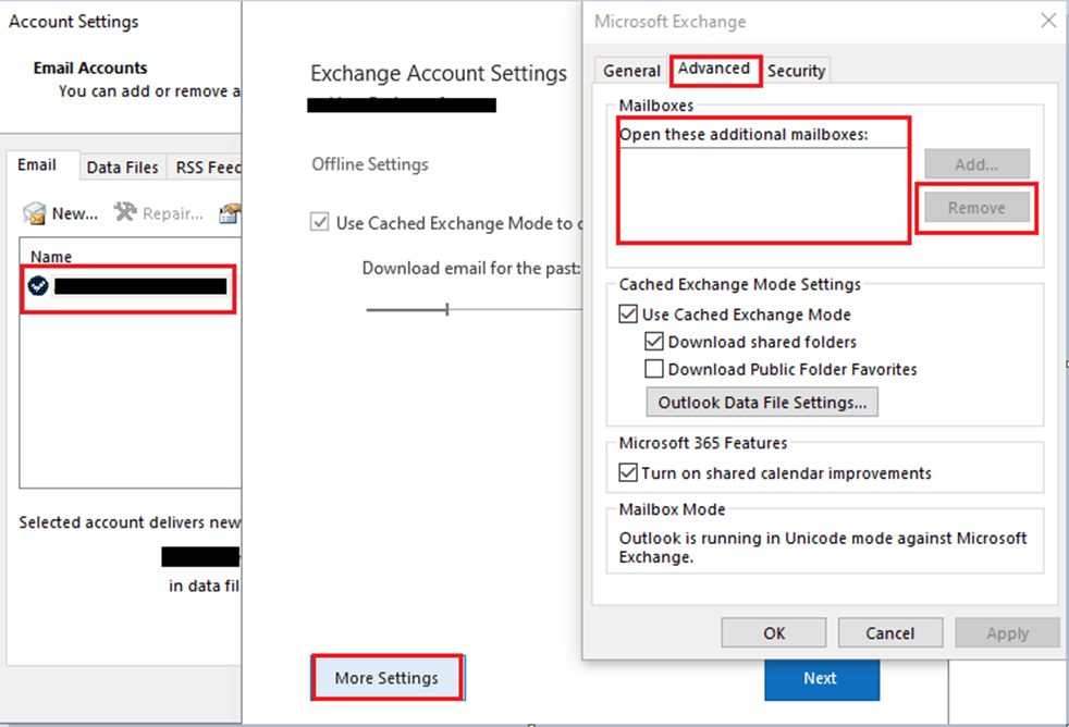 Open Outlook > go to File > Account Settings > select your account > go to More settings > select Advanced tab > under Mailboxes, check if the shared email account is visible there, if yes, select the Remove option to remove it.