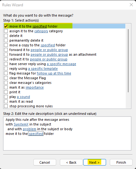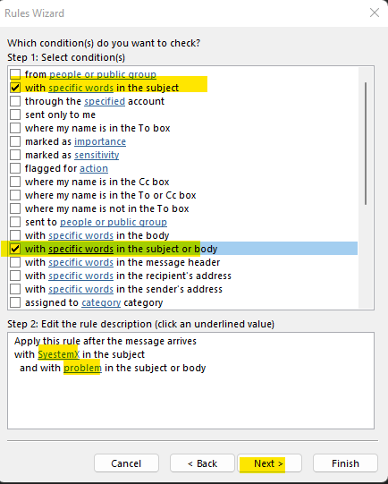 -Select with specific words in the subject or body--> then down edit the rule description (click an underlined value) enter problem-->Add-->Ok