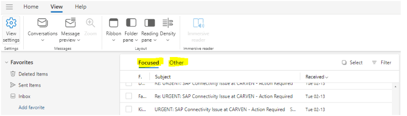 For my suggestion, you may go to View>View Settings and please check if Sort messages into Focused and Otheroptions enabled, you can disable it and select Don‘t sort my messages options enabled.