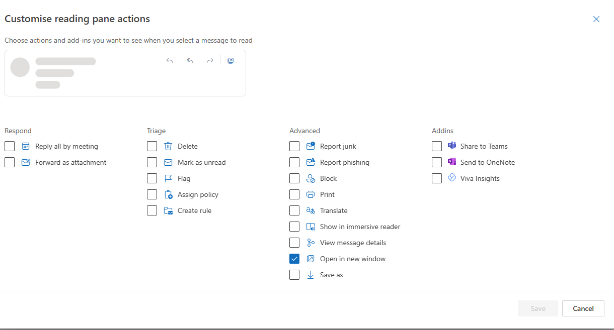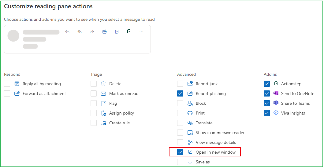 In the new outlook, you can double left click on the email from the list to open in a new tab. If you need to add it to the quick actions to appear beside sender names and subject lines in your message list, in the reading pane, click on more actions ... >Customize actions >check the option to open in a new window in the customize reading pane actions.