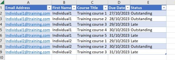 Ensure your spreadsheet has columns for "Individual ID," "Course Name," "Due Date," and "Status."