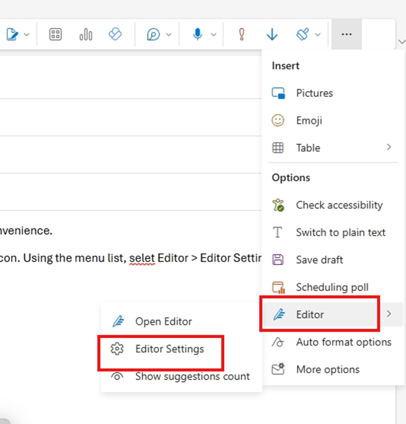 1.While in an email draft, in the simplified ribbon, select the (...) overflow menu.