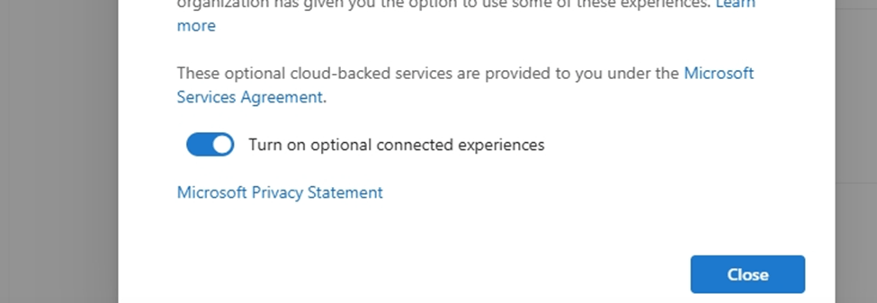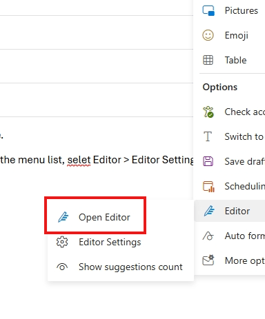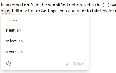 3.The Microsoft Editor Settings panel is displayed. Select the buttons on or off per your preferences. If needed, you can select Reset to default.