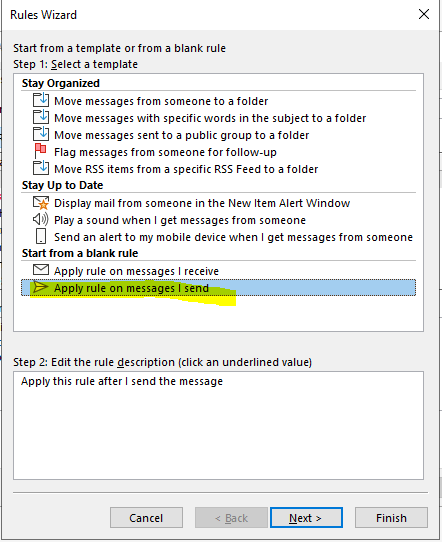 - In Start from a blank rulesection choose Apply rule on the message I send. Click Next.