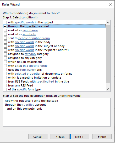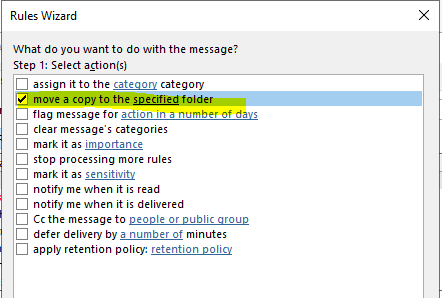 - Then you can create another rule in Outlook for Windows to automatically COPY the emails from your Sent Items folder to one specific folder.