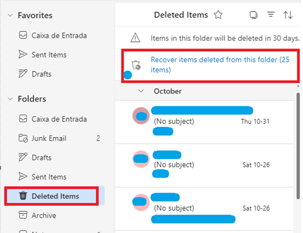 - In addition, you can check Deleted items and recoverable items for the presence of emails, if so, you can select these emails and restore them.