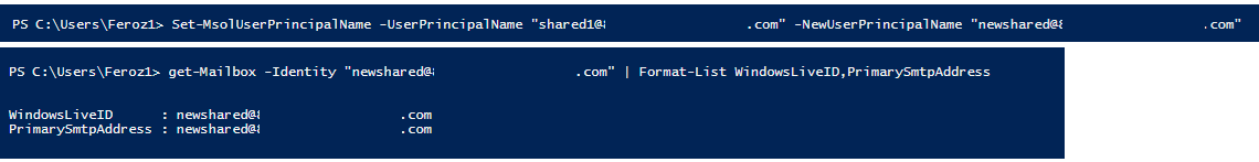 Reference: Set-MsolUserPrincipalName (MSOnline) | Microsoft LearnSet-MsolUserPrincipalName -UserPrincipalName "******@domain.com" -NewUserPrincipalName "******@domain.com" - Verify the Changes: After making the changes, you can verify them by running: