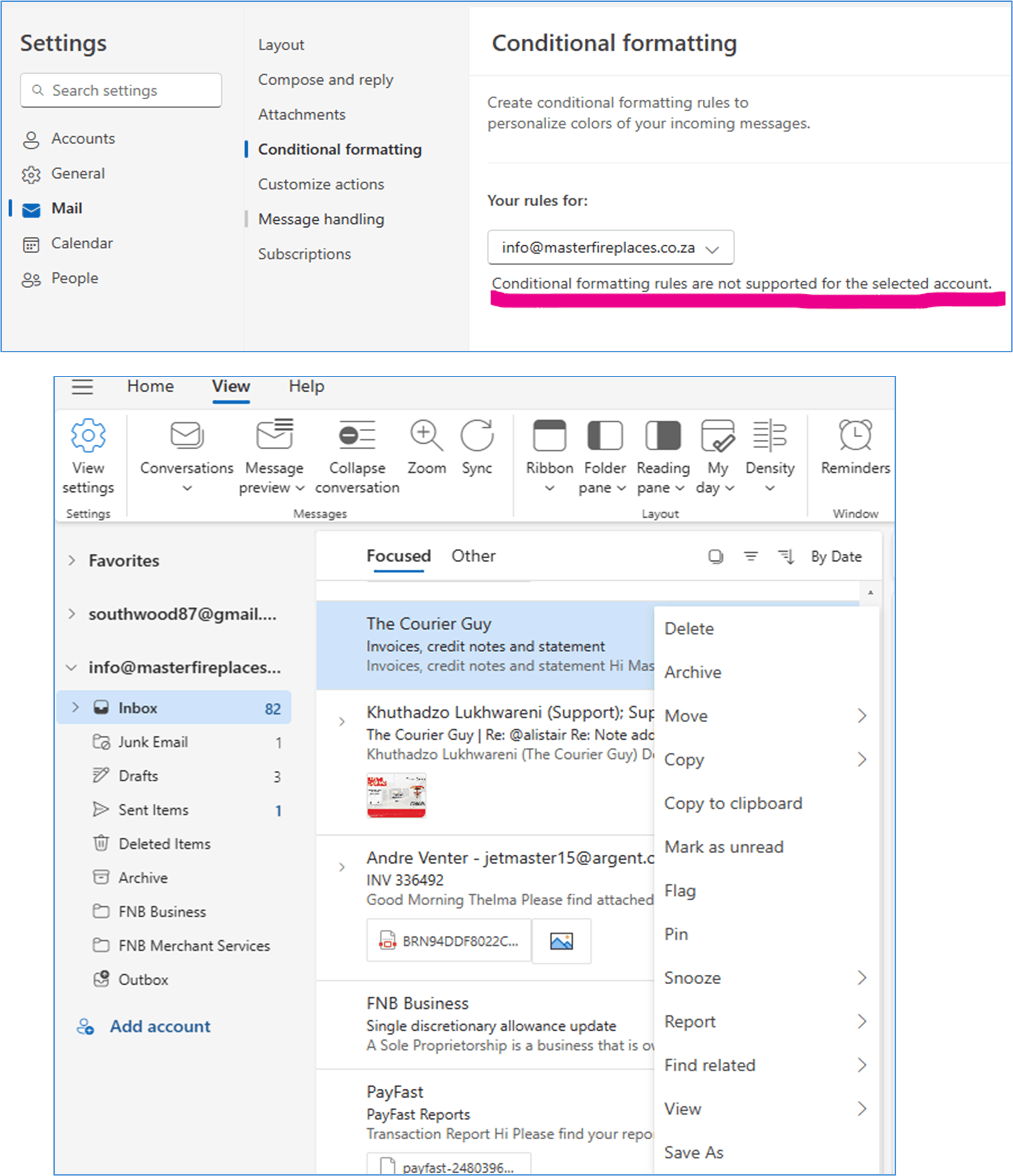 When I right-click on the email for which I want to create a conditional formatting rule, the drop-down selection does not give me an option to select create a rule (see attached image).
