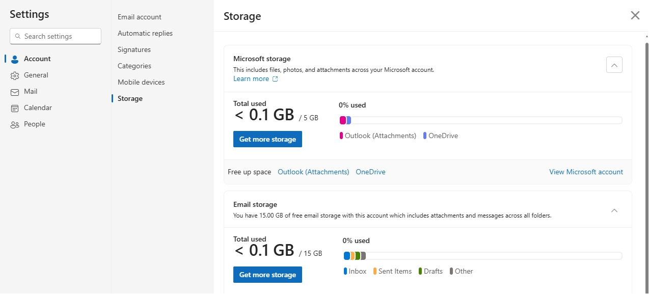 If your email address is for a Microsoft domain. Do you still have enough storage space? You can follow the steps below to check if Outlook/OneDrive still has enough space to check the emails, when the storage is full, you can manually delete some unwanted emails or attachments to free up space to download new emails or expand the storage space by purchasing.