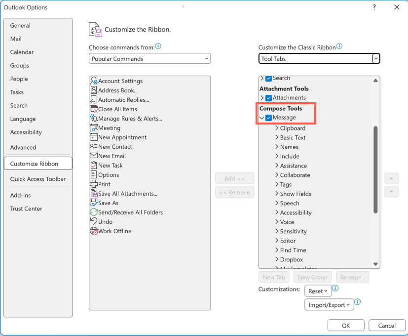 Are you editing in the reading pane or in an open message? When you compose in the reading pane the message options are limited.
