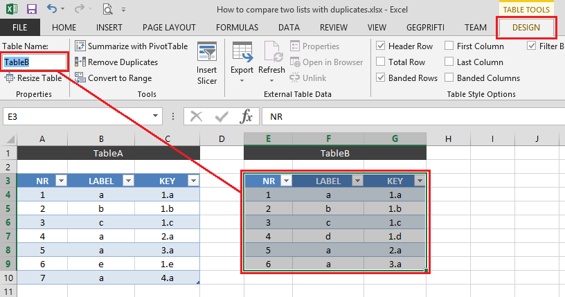 Just not to get confused it is best to name the new table. Click on any cell in the created table then go to DESIGN tab and in the Properties group change the table name to TableB.