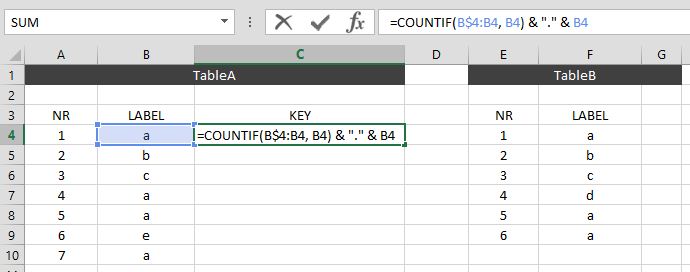 Drag the created formula in the following cells and you will see a result similar to the picture below. Getting “a” as an example you see that the first “a” gets the number 1, the second “a” gets the number 2 and so on.