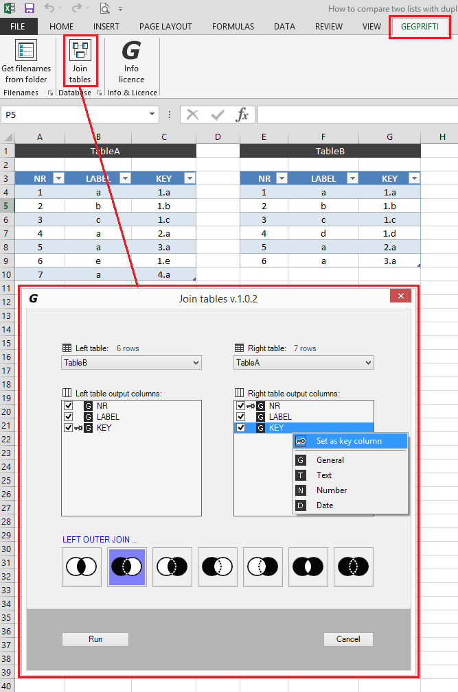 To join tables go to GEGPRIFTI tab and in the Database group click the Join tables button. In the Join tables dialog box: