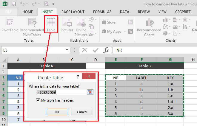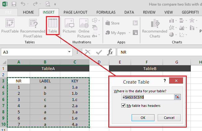 First you need to create the tables. Select the cells from the first table (Including headers) then go to INSERT tab and in the Tables group click the Table button. In the Create table dialog box check “My data has headers” the n click OK.